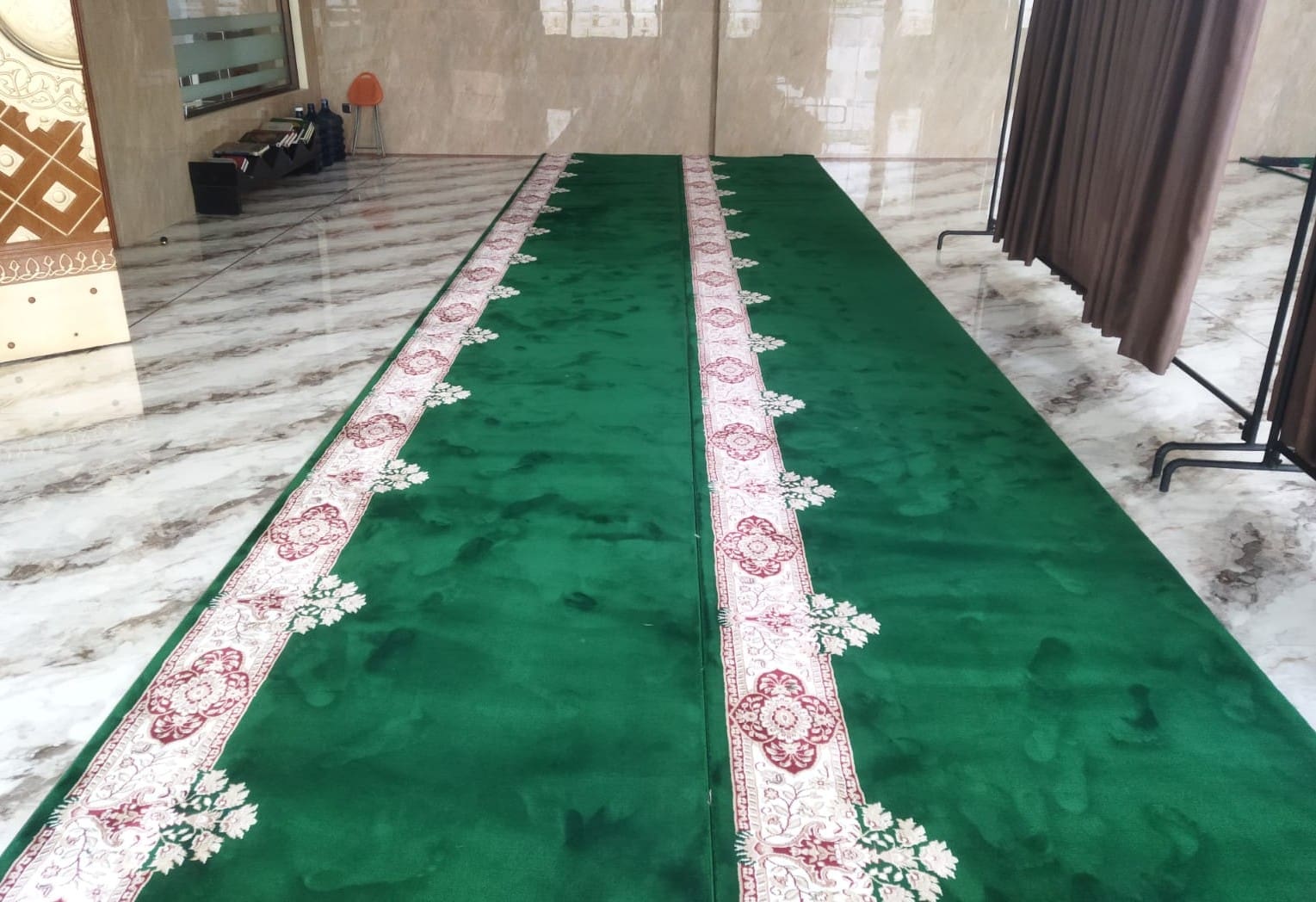 Karpet Masjid import Turkey nyaman, tebal, dan empuk dengan lebar shaf 1,2 meter. Ukuran bisa disesuaikan dengan kebutuhan ruangan anda. Proses potong dan obras dilakukan oleh profesional, sehingga hasilnya rapih dan kuat.