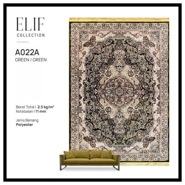 Elif Karpet Permadani merupakan karpet rumah dengan motif klasik impor buatan Turki. Terbuat dari material bahan benang polyester pilihan kualitas terbaik. kesan Elegan, Estetik, dan Mewah, nyaman untuk setiap interior rumah, ruang tamu, kamar tidur atau ruang keluarga.