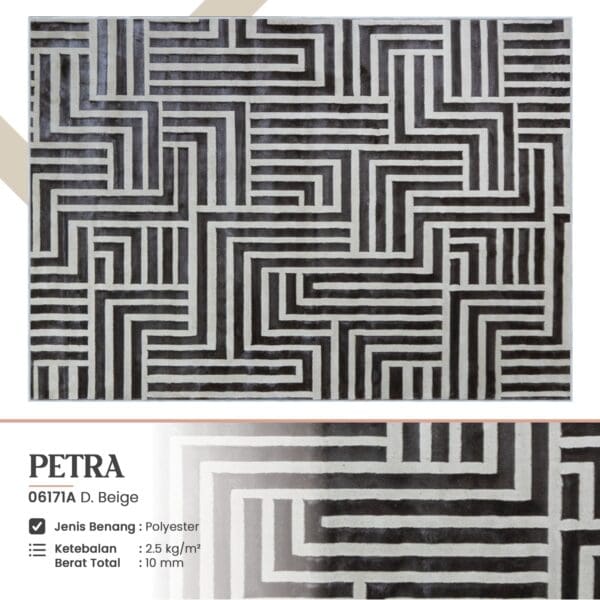Petra Karpet Permadani merupakan karpet rumah dengan motif klasik impor buatan Turki. Terbuat dari material bahan benang polyester pilihan kualitas terbaik. Mempunyai corak timbul yang memberi kesan Elegan, Estetik, dan Mewah, nyaman untuk setiap interior rumah, ruang tamu, kamar tidur atau ruang keluarga.