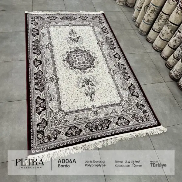 Petra Karpet Permadani merupakan karpet rumah dengan motif klasik impor buatan Turki. Terbuat dari material bahan benang polyester pilihan kualitas terbaik. Mempunyai corak timbul yang memberi kesan Elegan, Estetik, dan Mewah, nyaman untuk setiap interior rumah, ruang tamu, kamar tidur atau ruang keluarga.