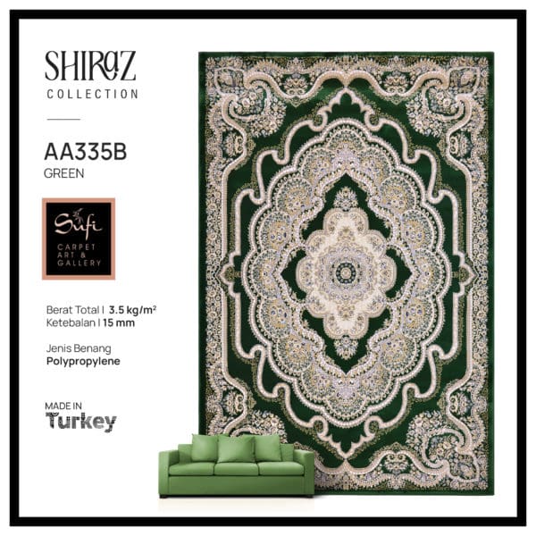Shiraz karpet permadani klasik mewah berkelas buatan Turki. Paduan warna dengan tampilan gaya oriental dan traditional menjadikan ruangan cantik dan elegant.