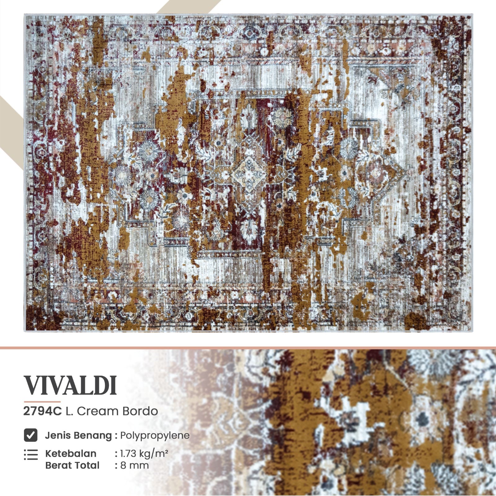 Vivaldi permadani karpet vintage minimalis pola yang tajam kombinasi warna yang pudar tertekan. Karpet vintage adalah karpet permadani yang terbaik dari permadani lainnya. Karpet ini memiliki sentuhan lembut, dan pola tesktur unik mengikuti trend masa kini.